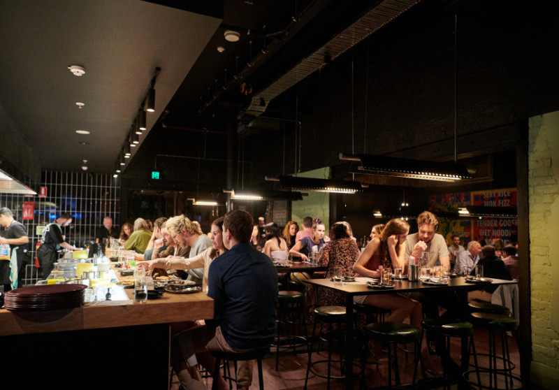 The open kitchen is a key feature of the dimly lit space. Large tables are built for communal dining while lazy Susans tick the boxes for both form and function. Peter van Zeller, previously of QT Perth, is in charge of the bar and the drinks list.