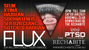 PTSD Promotions are pround to announce FLUX will be Staged @ one Perth's most reputable venue's bringing the FLUX Techno Experience to the basement of The Rechabite for an intimate, in your face Underground Techno Night.
