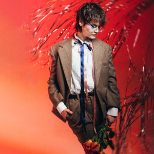 Photograph of P, member of the band Priscilla standing faced to the camera with their head turned to the side. They are wearing a brown suit with a white shirt underneath. Around their neck are two ribbons tied as floppy bow ties. One ribbon is dark blue and one is pink. They are holding a bouquet of red roses in their left hand, and their right hand is in their pocket. They have white skin, short brown hair and are wearing round silver glasses. They have blue eyeshadow under their eyes and are standing in front of a red gradient background with silver sparkly streamers flowing in the wind behind them.