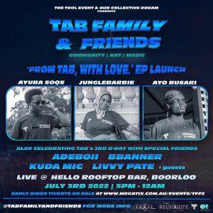 Join TAB Family & Friends at the launch of their debut ep 'From TAB, With Love' also featuring their Community and music Showcase in July. This creative show will bring together a diverse set of community, family and friends who have a shared interest in art and music.The show will include a variety of music performances, Dj set alongside Special guests who are friends of TAB Family.